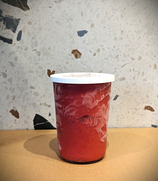 Fris framboos sorbet met echte frambozen (2.50 EUR waarborg moet nog ter plaatse betaald worden)